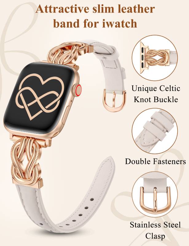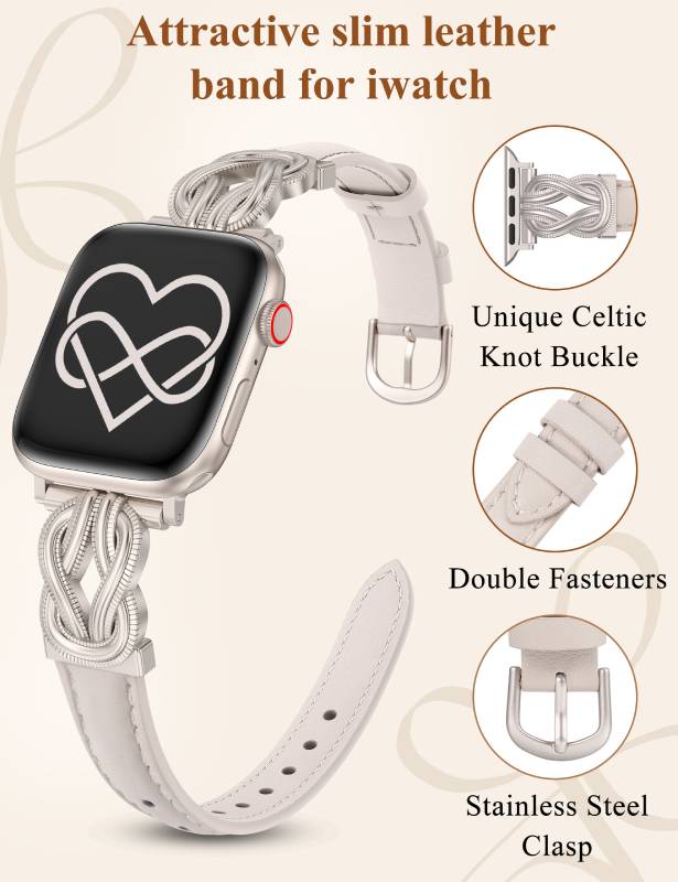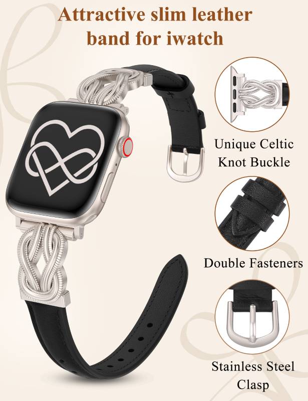 - Exclusive Designer Buckle: Elevate your style with these slim leather iwatch bands for women, showcasing a refined, thin design and a sophisticated interlock buckle. Inspired by Celtic knots, symbolizing luck and eternity, this band seamlessly blends timeless elegance with modern flair to enhance your look and earns endless compliments.